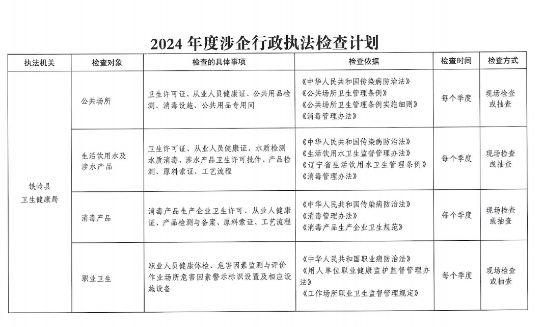 铁岭县卫生健康局2024年度涉企行政执法检查计划
