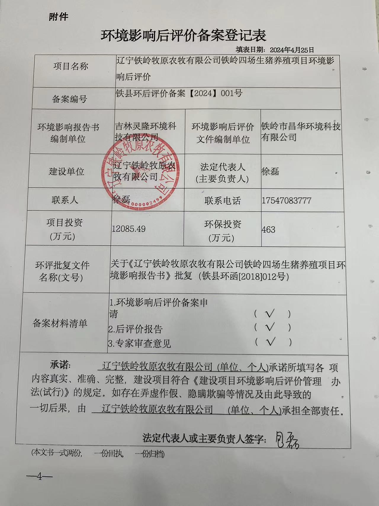 铁岭市生态环境局铁岭县分局现将《辽宁铁岭牧原农牧有限公司铁岭四场生猪养殖项目建设项目环境影响后评价》全文公布,公示期为2024年4月26日——2024年5月6日(5个工作日),现征求社会各界意见。欢迎有关单位和各界人士登陆铁岭市人民政府官网(http://www.tieling.gov.cn/)、铁岭县人民政府官网(http://www.tielingxian.gov.cn/)查看相关后评价备案信息并提出意见。意见可以通过信函或者电子邮件邮寄到铁岭市生态环境局铁岭县分局。